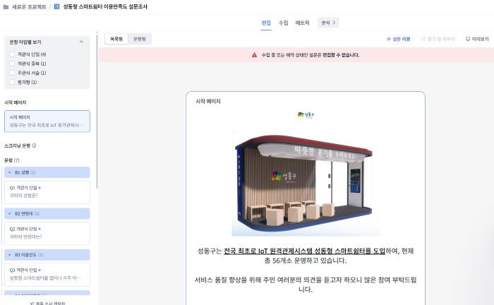 시범 도입한 AI 기반 플랫폼은 '성동형 스마트쉼터 만족도 조사'에 처음으로 적용된다. 설문조사는 11월 10일부터 23일까지 2주간 진행되며, 성동형 스마트쉼터 이용 만족도, 향후 스마트쉼터 활성화 방안 및 창의적인 아이디어를 수렴하는 것에 중점을 두고 있다. 성동구 누리집(홈페이지), 관내 스마트쉼터, 동주민센터 등에 게시된 정보무늬(QR코드)를 통해 설문에 참여할 수 있다.