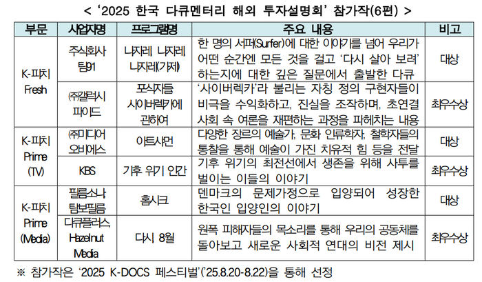 참가작은 ▲‘나자레, 나자레, 나자레’(㈜팀91) ▲‘아트샤먼’(㈜미디어오비에스) ▲‘홈시크’(필름소나/탐보필름) ▲‘포식자들:사이버렉카에 관하여’(㈜갤럭시파이드) ▲‘기후 위기 인간’(KBS) ▲‘다시 8월’(돌리고슬롯플러스/Hazelnut Media) 등 6편이다.