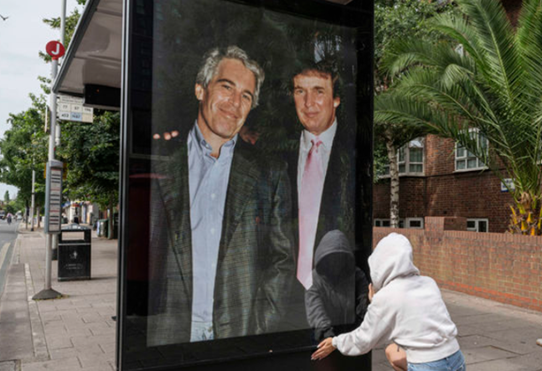 영국의 한 활동가가 지난 6월 20일 아동 성착취범 제프리 엡스타인(왼쪽)과 젊은 시절의 도널드 슬롯사이트 추천 미국 대통령의 사진을 런던 거리에 설치하고 있다. ⓒAP/뉴시스