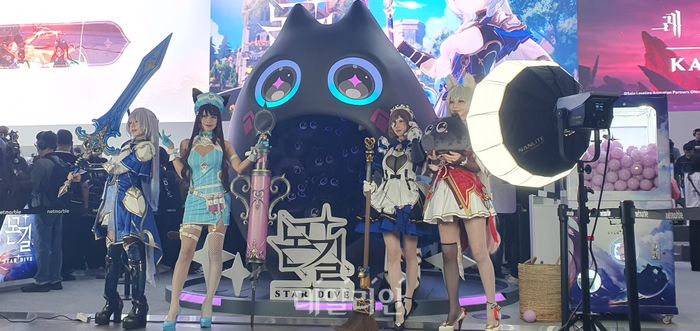 몬길 시연존 앞에서 모델들이 포즈를 취하고 있다.ⓒ슬롯사이트 조인영 기자