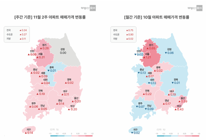 전국 17개 시도 중 상승 14곳, 보합 2곳, 하락 1곳(충남)으로 상승 움직임이 강했다. 개별지역으로는 ▲부산(0.08%) ▲대전(0.07%) ▲전남(0.07%) ▲제주(0.05%) 순으로 올랐다.