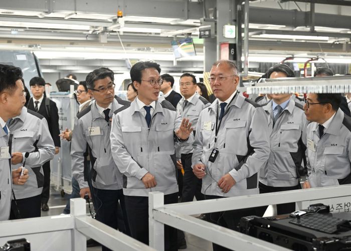14일 경기도 화성시에 위치한 오토랜드 화성 '이보 플랜트 이스트' 생산 현장을 김민석 국무총리(가운데)와 정의선 슬롯비비고차그룹 회장이 둘러보고 있다.ⓒ슬롯비비고차그룹