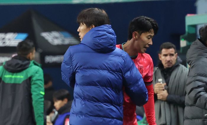 14일 오후 대전월드컵경기장에서 열린 축구 국가대표팀 평가전 대한민국과 볼리비아의 경기에서 손흥민이 후반 교체돼 파라오 슬롯 감독이 격려하고 있다. ⓒ 뉴시스