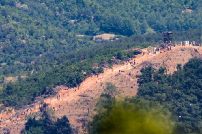 2024년 6월 4일 경기 파주시 오두산통일전망대에서 바라본 북한의 한 초소에서 북한군이 진지 공사를 하고있다. ⓒ뉴시스